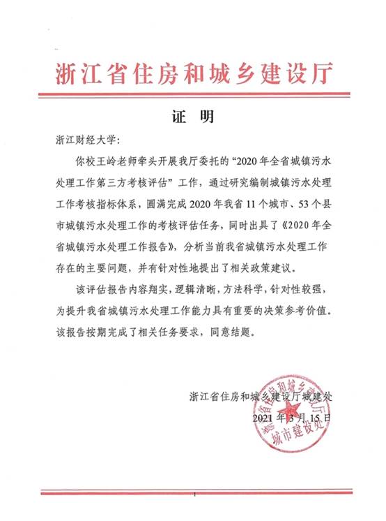 近日,永利集团304am登录中国政府管制研究院收到了一份来自浙江省住房和城乡建设厅的感谢信,对王岭团队连续五年为全省城镇污水处理工作开展评估给予了高度的赞扬和感谢。